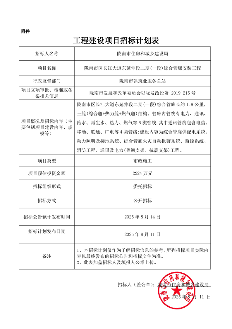 附件:隴南市區(qū)長江大道東延伸段二期(一段)綜合管廊安裝工程工程建設項目招標計劃表.pdf