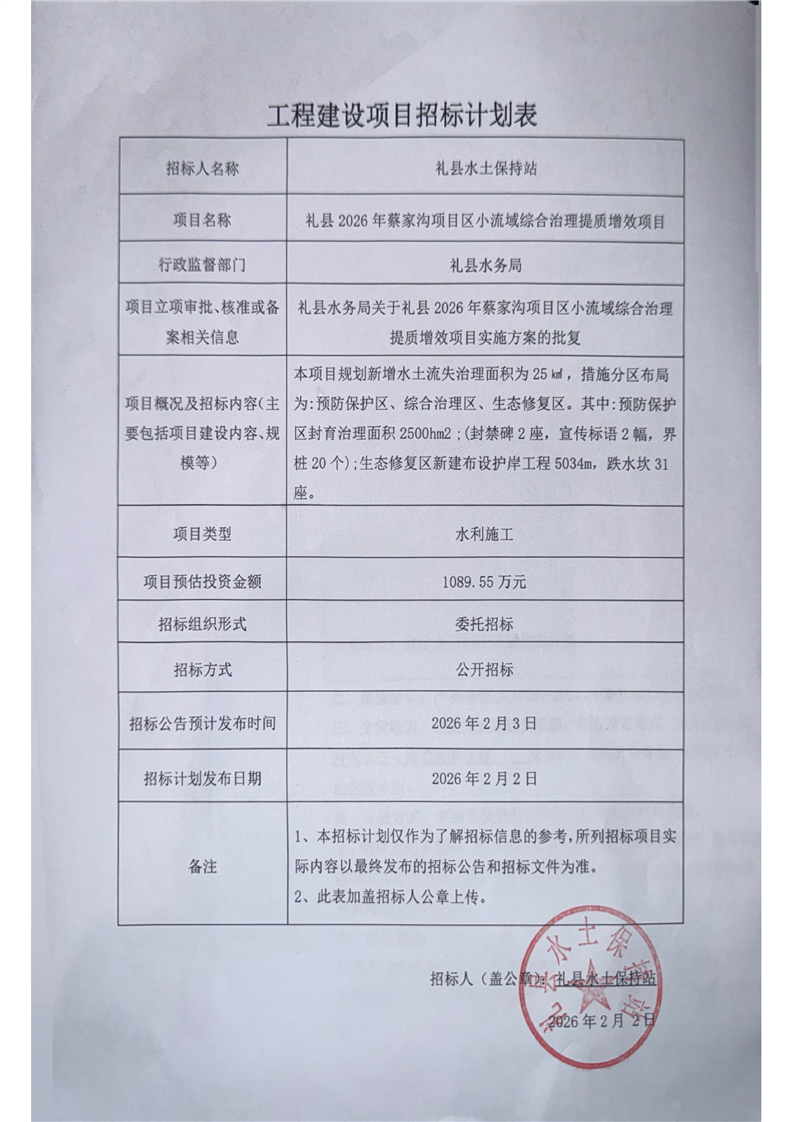 禮縣2026年蔡家溝項(xiàng)目區(qū)小流域綜合治理提質(zhì)增效項(xiàng)目