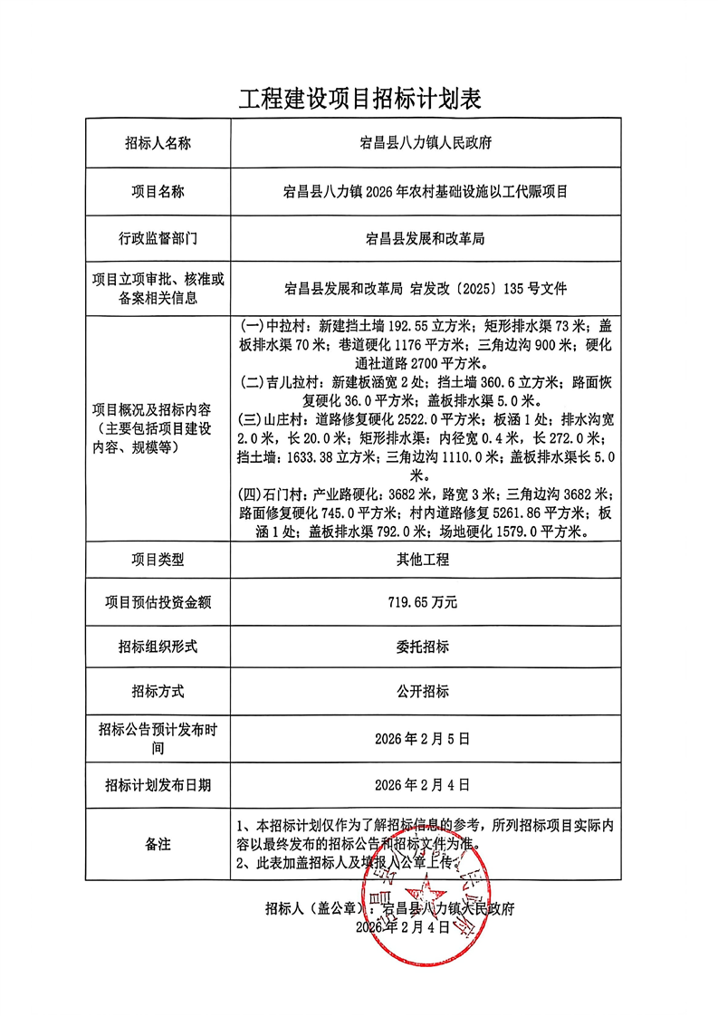 宕昌縣八力鎮(zhèn)2026年農(nóng)村基礎(chǔ)設(shè)施以工代賑項目