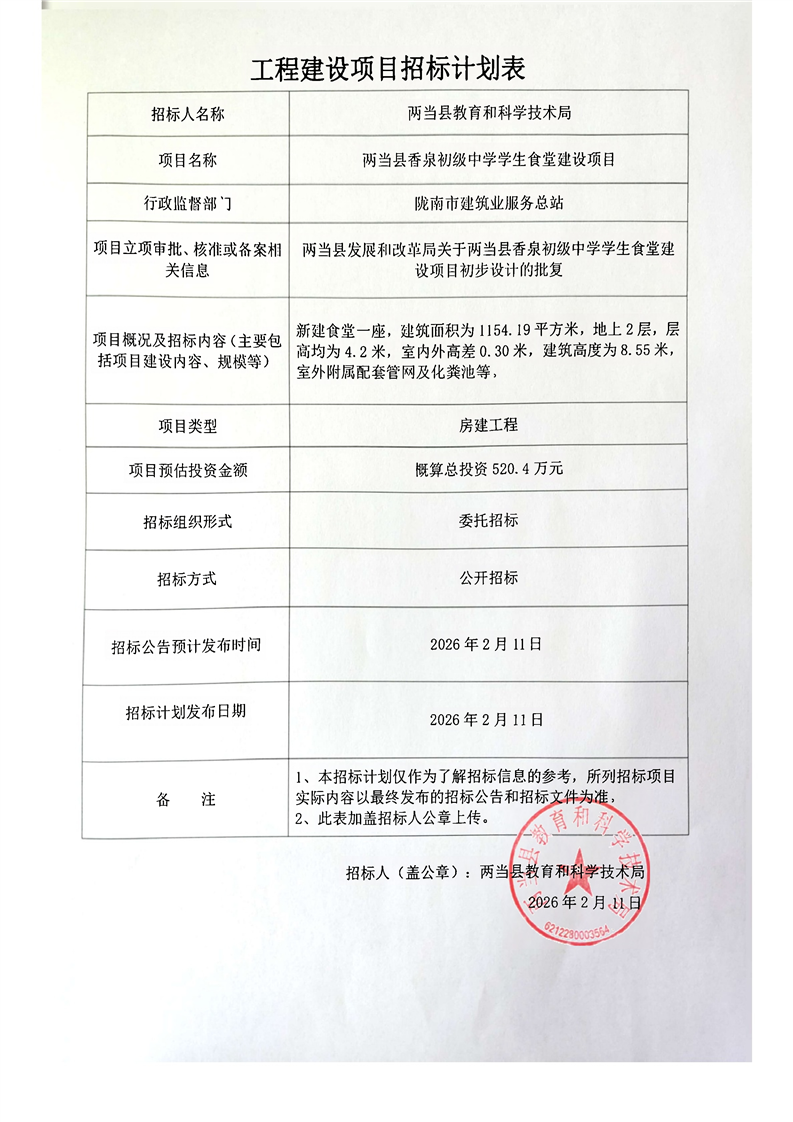 兩當(dāng)縣香泉初級中學(xué)學(xué)生食堂建設(shè)項目