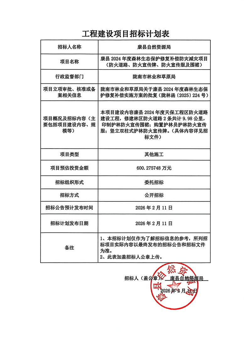 康縣2024年度森林生態(tài)保護修復補償防災減災項目(防火道路、防火宣傳牌、防火宣傳服及圍裙)