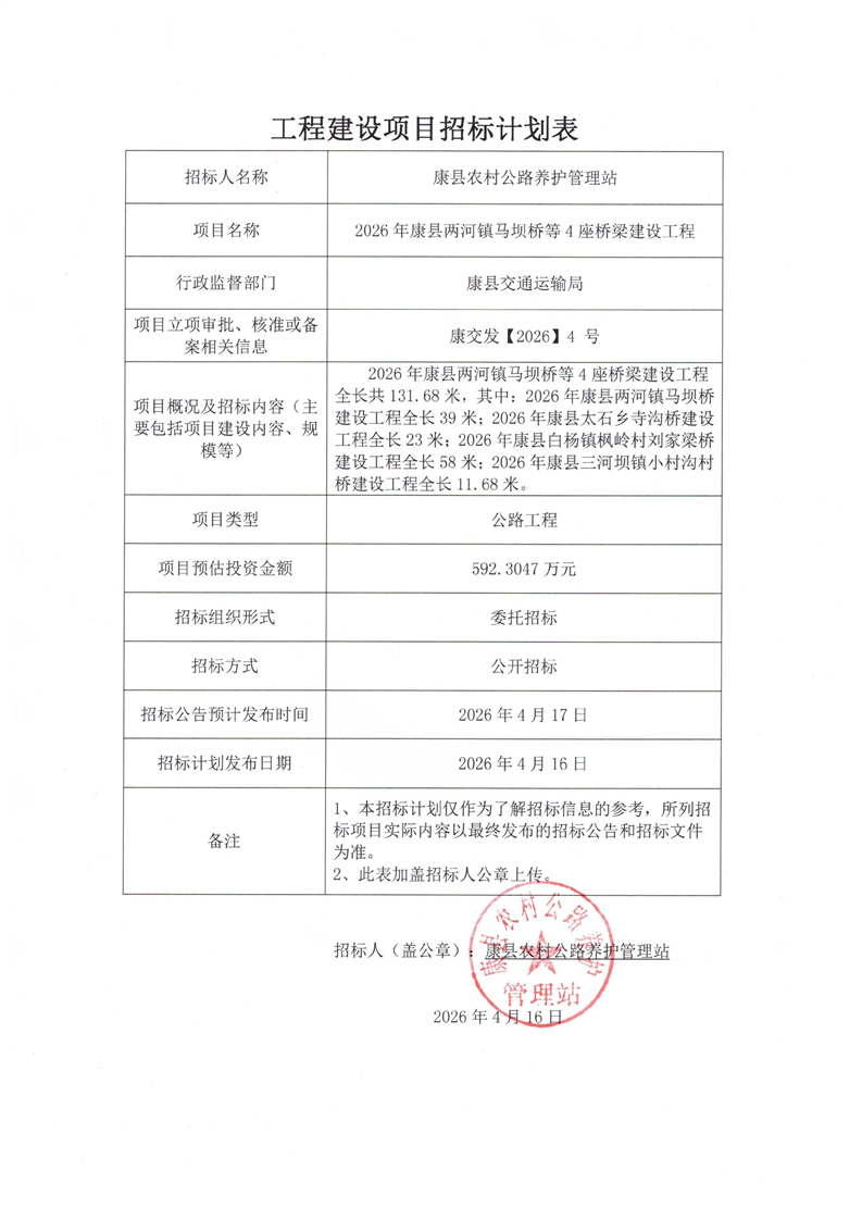 2026年康縣兩河鎮(zhèn)馬壩橋等4座橋梁建設(shè)工程